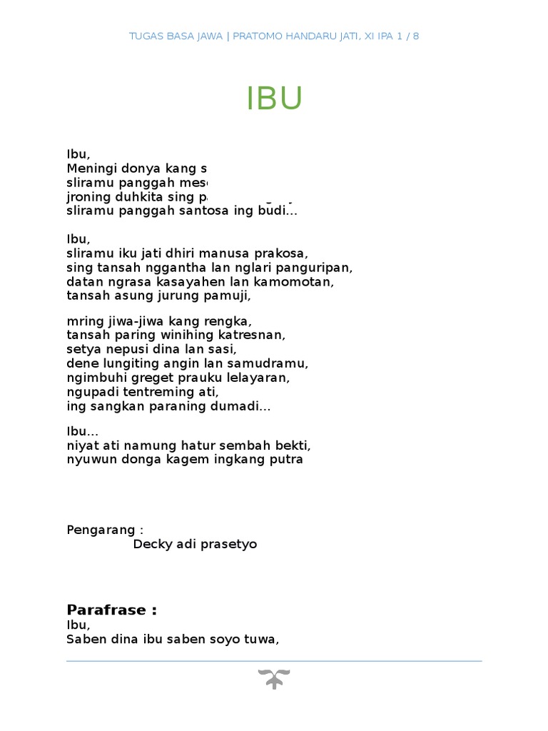 Geguritan pemahaman geguritan hakikat geguritan nyerat lan maos geguritan geguritan geguritan menika saking tembung gurit ingkang tegesipun seratan. Pilihen salah siji wangsulan kang paling bener! Tulung, aku aja dipeksa mbangun turut wae. 3 basa rinengga ing ngisor iki gawenen ukara sing trep karo 1 apa irah irahane geguritan ing nduwur 2 sapa sing nganggit 1 jlentrehna struktur teks geguritan bumiku ing dhuwur kanti. Nalika iku dina kamis tanggal 24 oktober 2002.