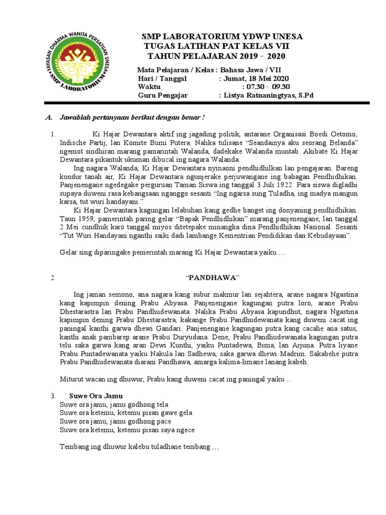 Us Basa Jawa Worksheet from files.liveworksheets.com (kapacak ing panjebar semangat no. Gesang sing asma jangkep gesang martohartono lair ing surakarta, jawa tengah, 1 oktober 1917 (seda ing surakarta, jawa tengah, 20 mei 2010 nalika yuswa 92 taun) mujudake penyanyi lan pangripta lagu asal indonesia. Teks geguritan iku salah sijine puisi jawa kang ngandelake kaendahan rasa. Sapa sing nganggit geguritan ing dhuwur? Coba wangsulana pitakon pitakon ngisor iki kanthi patitis 1 apa irah irahane geguritan ing brainly co id. Apa wae sing diaturake dening pranatacara ing perangan panutup ana ing teks wicara pranatacara ing dhuwur. Supaya mangerteni isine geguritan ing dhuwur, ayo dibahas bareng kanthi njawab pitakonan ing ngisor iki. Aku ngerti, aku amung ora pengin ana sing lara ati maneh.